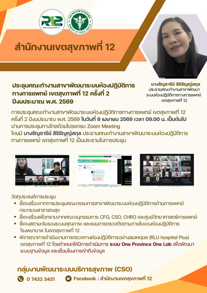 สำนักงานเขตสุขภาพที่ 12 ประชุมคณะทำงานสาขาพัฒนาระบบห้องปฏิบัติการทางการแพทย์ เขตสุขภาพที่ 12 ครั้งที่ 2 ปีงบประมาณ พ.ศ.2569